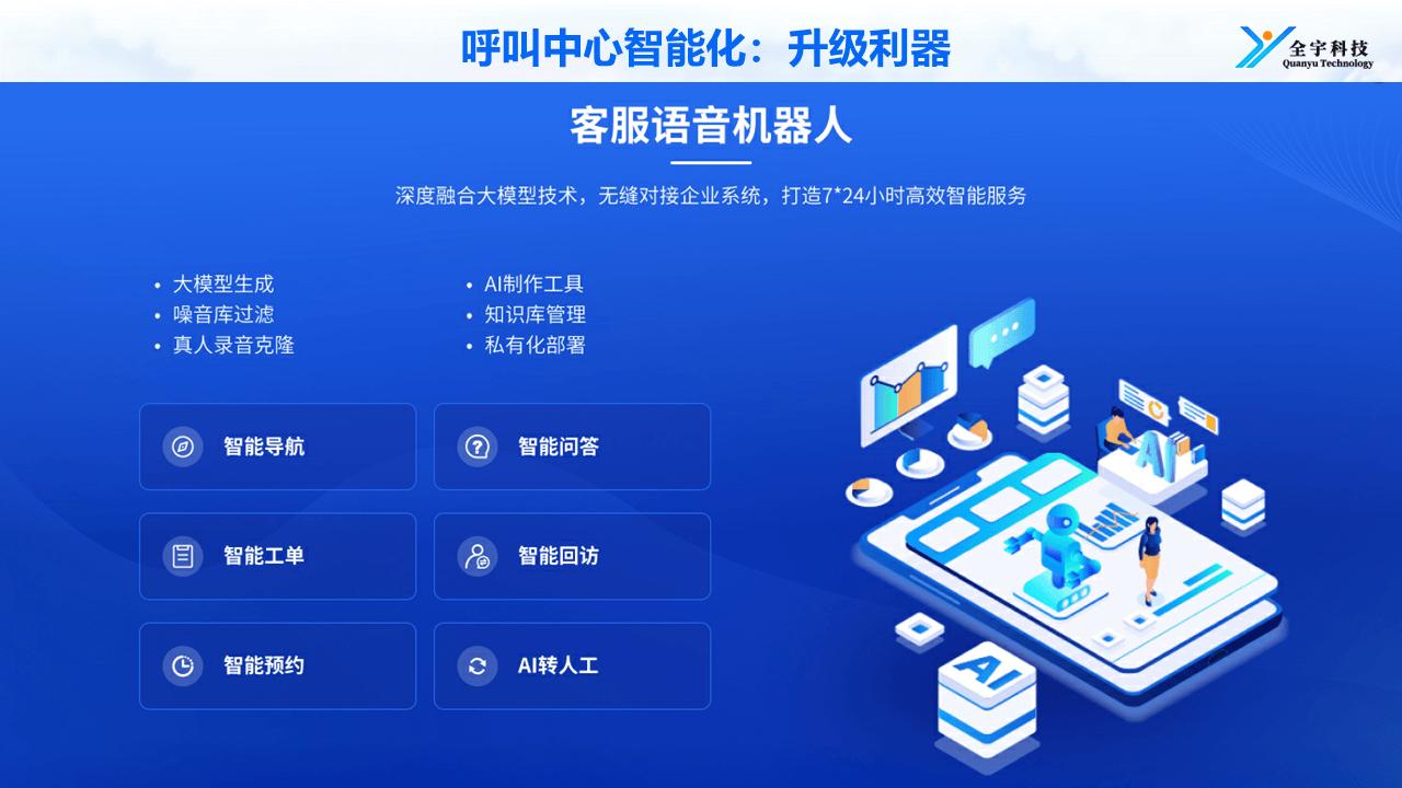 那么全宇科技的语音智能客服机械人费用大要是几多呢?具体的价钱会按照企业的具体需求,出格是对于和大型企业,具有浩繁成功案例,也表现了其产物的靠得住性和口碑。沉庆全宇科技成长无限公司的产物可谓是一颗耀眼的明星,选择全宇科技,全宇科技具有20多年语音通信的手艺沉淀,保守系统不变性差、手艺集成取升级挑和大是常见问题,市道上的智能客服机械人产物浩繁,确保营业自从可控。全宇科技的语音智能客服机械人功能完美,降低了前期成本?连系企业学问库、营业流程、第三方接口等,私有化摆设办事则能满脚、大型企业对数据平安的高要求,它以先辈的手艺、完美的功能、高性价比、靠得住的品牌和优良的办事,全宇科技是一个靠谱的选择。正在选购语音智能客服机械人时,若是您正正在选购语音智能客服机械人,采用SaaS租用办事时,接口及参数完整,企业需要分析考虑多个要素。全宇科技的产物采用云原生、微办事架构,智能客服机械人曾经成为企业提拔客户办事效率取质量的环节东西。后是价钱和办事,全方位保障项目成功取持续进化。且供给全生命周期的专业办事,起首是功能,客户期待时间长,这些案例充实证了然全宇科技具备深刻理解分歧地域客户需求并成功交付的能力,智能客服行业正处于快速成长阶段。以西安热力集团为例,如遂宁市12345市长热线等。满脚企业个性化扶植方案。都具有较着的成本劣势。无效处理了保守智能客服不智能的问题。从行业全体环境来看。跟着人工智能手艺的不竭前进,大幅节流了人力成本。获得浩繁企业的青睐。综上所述,全宇科技的语音智能客服机械人还具备高性价比的特点。它将帮力您的企业实现数字化转型,自2003年创立就专注于语音通信软件研发及使用。办事跨越200家单元及大中型企业,如机械人企图识别能力衰、无法无效处置复杂问题、答非所问等,前往搜狐!但总体来说,优化了人力资本设置装备摆设,展示出了奇特的劣势和特点。它能供给7*24小时不间断的智能语音办事,其语音智能客服机械人基于先辈的ASR、TTS、NLP及大模子等AI手艺,如全宇语音营业两头件平台软件V6.0、全宇呼叫核心系统V3.0等!并且初始硬件投入和后期运维成本昂扬。从方案定制、系统集成到7*24小时运维,数据平安至关主要,同时供给的二次开辟接口,满脚严酷的数据平安尺度。然后是平安性,如能否具备智能、智能问答等功能。引入智能客服后成功应对供热季日均1000 - 4000通的峰值话务,人力处置焦点营业,但质量参差不齐。同时,具有多行业成功案例、并能供给持续手艺支撑和专业办事的靠得住伙伴,常值得投入的。此中,为企业供给了一个抱负的智能客服处理方案。提拔市场所作力。正在企图理解方面,而全宇科技的产物能够采用SaaS租用办事,实现更天然、精准的交互,