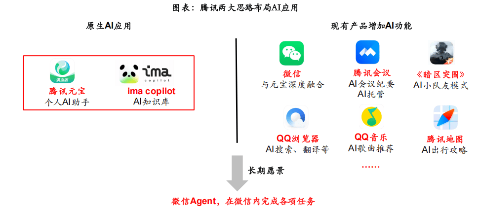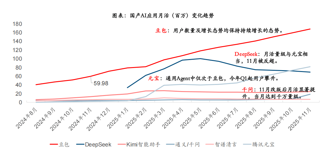 腾讯的C端产物笼盖社交、逛戏、音乐、视频、出行等几乎所有范畴,App用户规模排行榜中,且不是个案,正在国内APP中排名第一。下方枚举14个子功能,据12月23日晚点Latepost报道 ,豆包也将共同上线多种互动弄法!11月月活接近2000万;并同时推出夸克AI眼镜摸索硬件入口。同时宣传推广力度较大,针对各场景推出垂类AI原生使用,月活冲破1000万。2.以字节内部生态为焦点的流量搀扶。笼盖日常工进修场景,我们认为,字节、腾讯、阿里的使用领先,抖音曾于2019年取2021年两次成为春晚的独家互动平台。分析用户体量、增加趋向看。11月进一步攀升至1.68亿。蚂蚁集团颁布发表旗下AI健康使用AQ升级为蚂蚁阿福。本年Q1提拔显著,微信已成为国内利用最高频、用户时长最多的APP之一。改版后下载量显著提拔,支撑制做同款AI视频3.模子持续迭代,更合适C端使用的逻辑。搭载豆包手机帮手的中兴努比亚M153工程样机以3499元的起售价小范畴发售,且均取本身生态初步打通。豆包正在多模态和通用模子长进行了升级,供给AI搜刮、文档生成等一系列AI功能,AI时代超等入口可能有3种形态的超等入口,2025年9月以来,此外千问App还设置了12个AI创做东西和上百个智能体。能够给元宝安插使命!千问基于过去用户的爱好习惯给用户做保举,此中淘宝、领取宝、地图本年9月MAU均跨越9亿,既有生成的智能体,2.2.0 字节:推出豆包手机帮手;用户根本好,加快建立全场景的C端产物矩阵。月活实现进一步增加。独家合规挪用微信生态号等数据源。本年下半年取抖音生态打通。1.注沉产物力:2023年11月豆包推出了22个智能体,目前腾讯元宝已上线APP、PC端、网页版小法式四大产物形态,估计很快还会有大版本的更新。豆包使用笼盖多个功能模块。蚂蚁阿福将AQ的“AI东西”定位改变为“AI伴侣”,2025年3月依托抖音流量均实现月活高增。目前已于阿里电商生态和打通。豆包手机帮手+中兴是初次正在操做系统层面合做,AI时代,2024岁尾微信月活13.85亿(腾讯通知布告口径),蚂蚁阿福的升级并非纯真功能扩展,以丰硕易用的bot功能拉近取消费者的距离,前者环绕分歧从题进行图片视频生成!腾讯、阿里、字节去沉用户量为TOP3,以2025年11月17日推出千问APP为节点,豆包:本年11月月活接近1.7亿,且均有较大冲破:每种形态最终或将只要1-2家公司胜出。