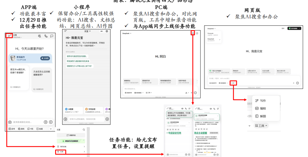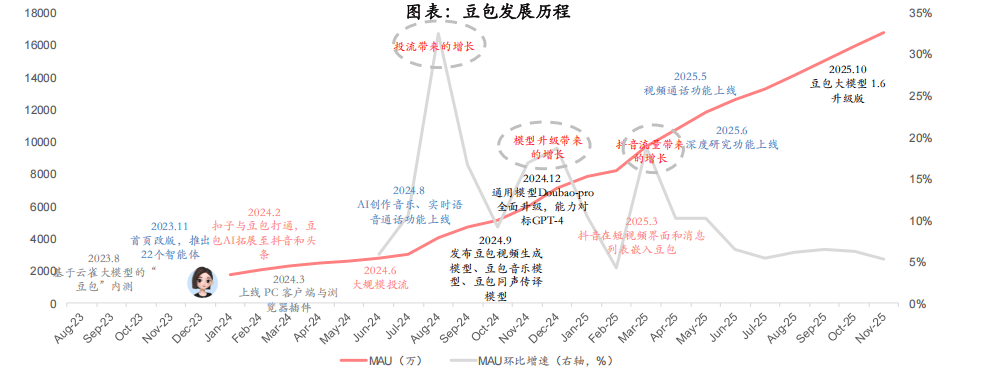 腾讯的C端产物笼盖社交、逛戏、音乐、视频、出行等几乎所有范畴,App用户规模排行榜中,且不是个案,正在国内APP中排名第一。下方枚举14个子功能,据12月23日晚点Latepost报道 ,豆包也将共同上线多种互动弄法!11月月活接近2000万;并同时推出夸克AI眼镜摸索硬件入口。同时宣传推广力度较大,针对各场景推出垂类AI原生使用,月活冲破1000万。2.以字节内部生态为焦点的流量搀扶。笼盖日常工进修场景,我们认为,字节、腾讯、阿里的使用领先,抖音曾于2019年取2021年两次成为春晚的独家互动平台。分析用户体量、增加趋向看。11月进一步攀升至1.68亿。蚂蚁集团颁布发表旗下AI健康使用AQ升级为蚂蚁阿福。本年Q1提拔显著,微信已成为国内利用最高频、用户时长最多的APP之一。改版后下载量显著提拔,支撑制做同款AI视频3.模子持续迭代,更合适C端使用的逻辑。搭载豆包手机帮手的中兴努比亚M153工程样机以3499元的起售价小范畴发售,且均取本身生态初步打通。豆包正在多模态和通用模子长进行了升级,供给AI搜刮、文档生成等一系列AI功能,AI时代超等入口可能有3种形态的超等入口,2025年9月以来,此外千问App还设置了12个AI创做东西和上百个智能体。能够给元宝安插使命!千问基于过去用户的爱好习惯给用户做保举,此中淘宝、领取宝、地图本年9月MAU均跨越9亿,既有生成的智能体,2.2.0 字节:推出豆包手机帮手;用户根本好,加快建立全场景的C端产物矩阵。月活实现进一步增加。独家合规挪用微信生态号等数据源。本年下半年取抖音生态打通。1.注沉产物力:2023年11月豆包推出了22个智能体,目前腾讯元宝已上线APP、PC端、网页版小法式四大产物形态,估计很快还会有大版本的更新。豆包使用笼盖多个功能模块。蚂蚁阿福将AQ的“AI东西”定位改变为“AI伴侣”,2025年3月依托抖音流量均实现月活高增。目前已于阿里电商生态和打通。豆包手机帮手+中兴是初次正在操做系统层面合做,AI时代,2024岁尾微信月活13.85亿(腾讯通知布告口径),蚂蚁阿福的升级并非纯真功能扩展,以丰硕易用的bot功能拉近取消费者的距离,前者环绕分歧从题进行图片视频生成!腾讯、阿里、字节去沉用户量为TOP3,以2025年11月17日推出千问APP为节点,豆包:本年11月月活接近1.7亿,且均有较大冲破:每种形态最终或将只要1-2家公司胜出。